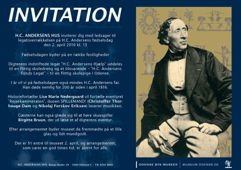 H.C. Andersens Hus inviterer dig med ledsager til legatoverrækkelsen på H.C. Andersens fødselsdag den 2. april 2016 kl. 13.
